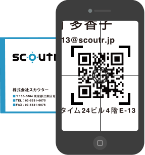 Scoutrは名刺に貼られたQRコードを、スマートフォン等のQRコードリーダーで読み取る事で相手が登録した名刺情報、写真、地図、学歴、職歴などの詳細情報を数秒で取得することが出来る便利なサービスです。